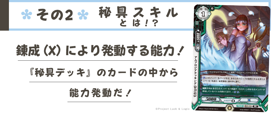 1.秘具デッキは、秘具スキルを持つカードを4枚まで入れることができます。秘具スキルを持たないカードは秘具デッキに入れることはできません。