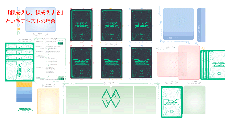 2.一つの能力の中に複数の錬成がある場合(例えば、「錬成②し、錬成②する。」といった能力)、同じカードを公開して2回能力を使用することは出来ません。秘具デッキ内に同名カードが2枚ある場合は可能です。